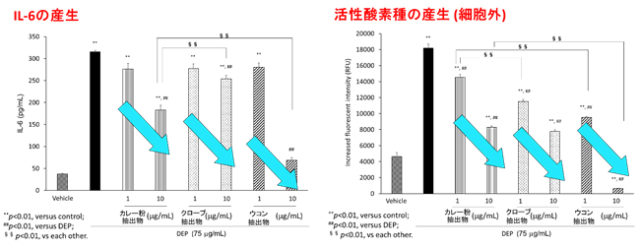 最初に、カレー粉、クローブ、ウコン(両スパイスは一般的にカレー粉に用いられ、PM2.5に対する効果が既に報告されているオイゲノールまたはクルクミンを豊富に含みます)のそれぞれについて、ヒト気道上皮細胞を対象に試験を行いました。細胞にディーゼル排気微粒子(以下DEP)懸濁液を曝露後、カレー粉、クローブ、ウコンの抽出物を添加後培養し、炎症反応の指標として炎症性サイトカイン産生量(24時間後の培養上清中IL-6濃度)を確認しました。メカニズムについて考察するために、細胞外の活性酸素種の産生量として3時間後の細胞非存在下の活性酸素種濃度についても確認しました。