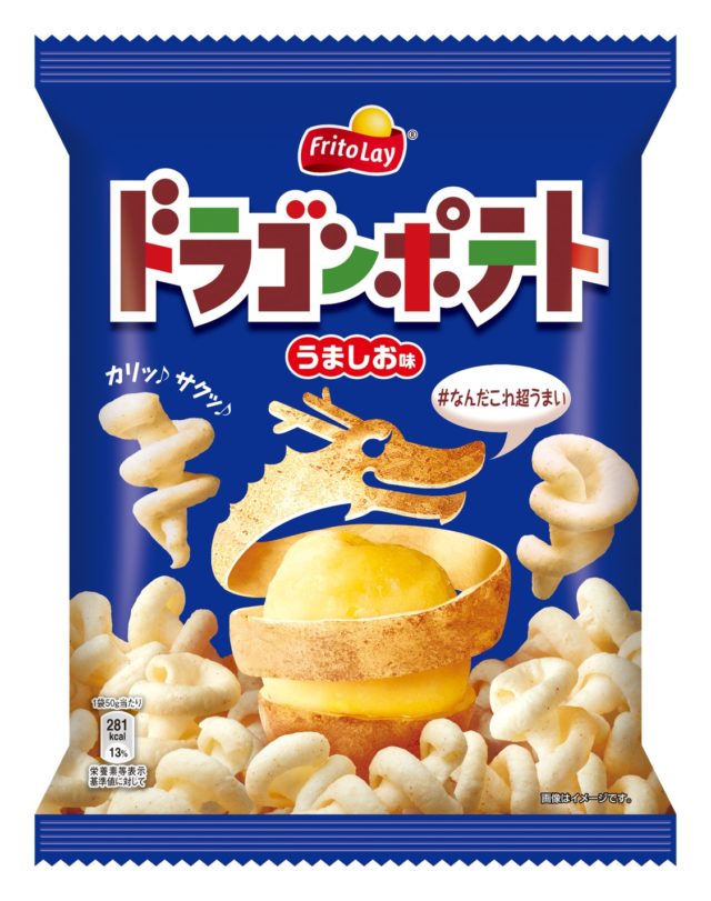 2018年4月に全国発売したドラゴンポテトは“ドラゴン”という言葉に抱く気持ち同様、ワクワク楽しい気分でお楽しみいただけるオモチャ感覚スナック菓子です。構想に3年をかけ、革新的な巻き上がるドラゴン型を実現しました。特殊技術でクリエイトされた空間がカリッサクッと崩れる軽やかな食感、噛むほどに溢れるポテトの旨味、優しい口どけが魅力のニュースタンダードスナックです。通年品として「うましお味」「バターしょうゆ味」「明太マヨ味」が展開されています。