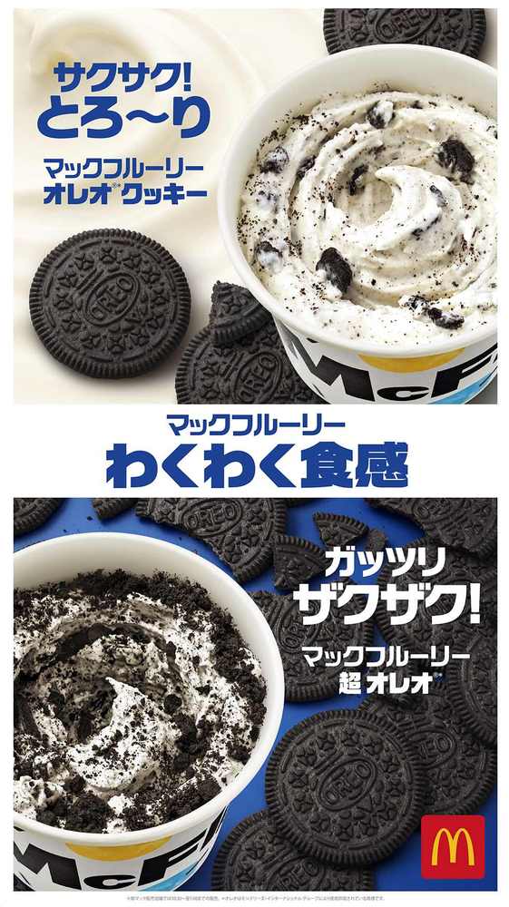ガッツリザクザク「マックフルーリー 超 オレオ®」とサクサクとろ~り「マックフルーリー オレオ®クッキー」の2種類がレギュラー商品として揃うことで、その時の気分に合わせて、選べる2つのわくわく食感、そして味わいを楽しむことができるようになっています。