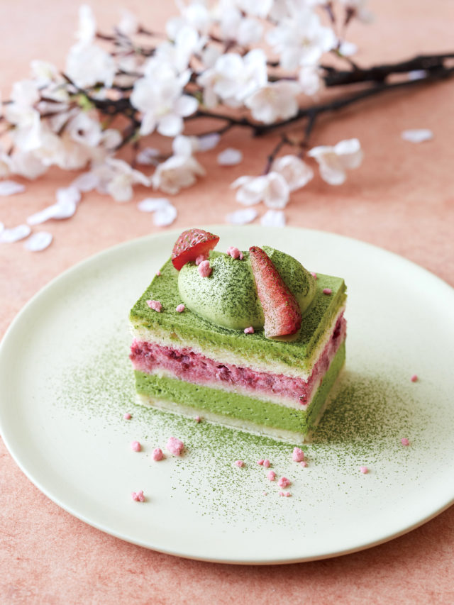 商品説明:ホワイトチョコレート入りの抹茶クリームと甘酸っぱいラズベリークリームをサンドした3層のレイヤーショートケーキ。
