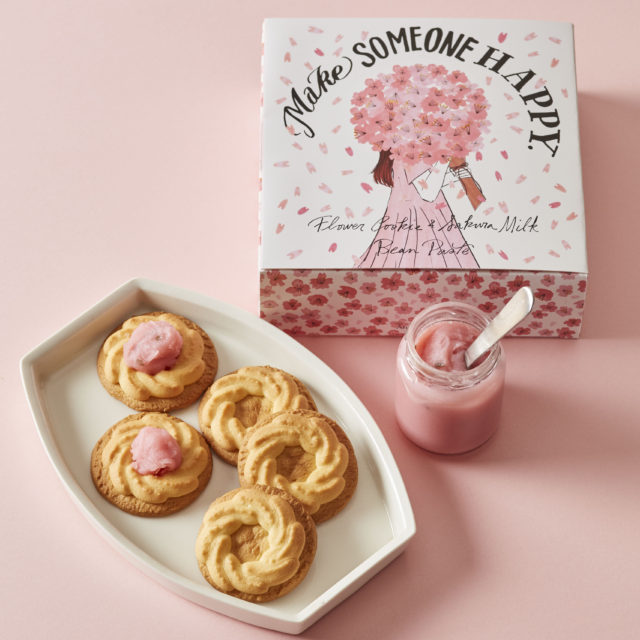 商品説明:フラワークッキーと春限定のさくらミルクあん、オリジナルスプーンのセット。クッキーの真ん中にピンク色のあんペーストをのせて、かわいいお花のクッキーを楽しめるようになっています。(フラワークッキー 5個、さくらミルクあん 150g、オリジナルスプーン 1個)