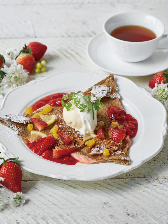 新作のいちごスイーツとしてフランス産のそば粉を使用した「苺とカスタードクリームのガレット」も登場。とろりとしたアーモンドミルク入りのカスタードクリームが入ったガレットに、甘酸っぱい自家製のストロベリーソースをたっぷりつけて楽しめるようになっています。