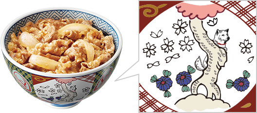 吉野家は食事をおいしく彩るための器にこだわり、創業当時より有田焼の丼を使用しています。並盛、大盛、特盛とすべて大きさが異なり、並盛の丼には湯気を表す“7つの点”、牛丼のおいしさは横綱級を示す“しめ縄”をデザインしています。