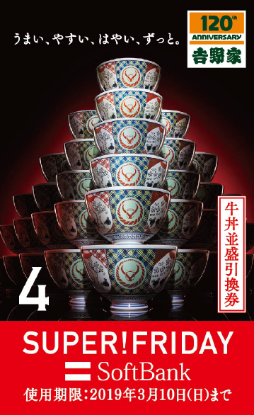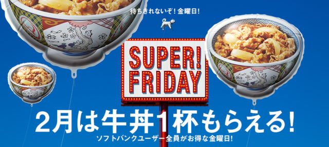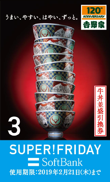 株式会社吉野家は、2019 年2月の毎週金曜日に、ソフトバンク株式会社 とのコラボレーション企画「SUPER FRIDAY」を実施中です。 「SUPER FRIDAY」はソフトバンクのスマートフォン*1を利用中のお客さまに配信されるクーポンを全国の吉野家 *2で 2019 年2月の毎週金曜日 10:00-22:00*3の時間帯に画面提示すると、牛丼並盛 380 円(税込)を1杯もらえるお得な企画です。「SUPER FRIDAY」は2月 15 日(金)と2月 22 日(金)も実施します。昨年の大好評を受け、今年も実施する運びとなった同企画を楽しむポイント案内をしています。