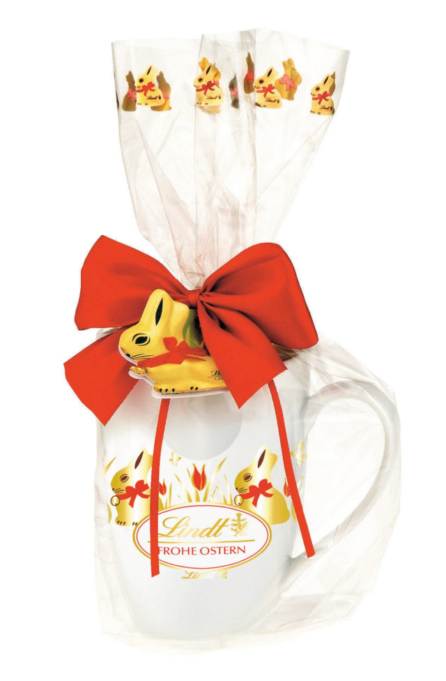 10gのミニゴールドバニーが10個入った、ゴールドバニーとリンツのロゴ入りマグカップ