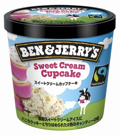 新発売する『スイートクリームカップケーキ』は、ベン&ジェリーズ人気No.1の「コットンキャンディー」の姉妹フレーバーです。わたあめ味のアイスクリームに、ちりばめられたキャンディーの粒が相性抜群の「コットンキャンディー」はスイーツ系アイスとして愛されてきました。今回その「コットンキャンディー」の姉妹フレーバーとして登場する『スイートクリームカップケーキ』は、濃厚なスイートクリームアイスに、サクサクした食感が楽しいバニラクッキーチャンクと、ドリーミーなピンクとブルーのキャンディーチャンクがゴロゴロ入った、まさにカップケーキにインスパイアされた、見た目もかわいいフレーバーです。近年流行のスイーツ系アイスクリームとして、まるでカップケーキをアイスクリームに閉じ込めたような味わいを楽しむことができます。