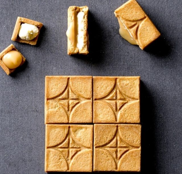 クッキーはこの商品のために開発したオリジナルのプレス機を使い、和菓子の製法にルーツを持つ「はさみ焼き」を採用しています。ブランドのアイコンにもなっている、商品にプレスされた幾何学模様は、力学的に割りやすいよう設計されたデザインが刻印されています。