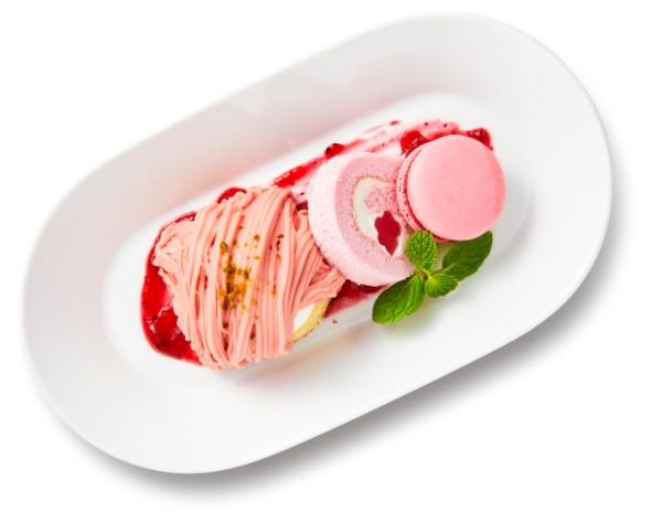 あまおう苺使用のモンブラン、桜ゼリー入りピンクロールケーキとラズベリーマカロン