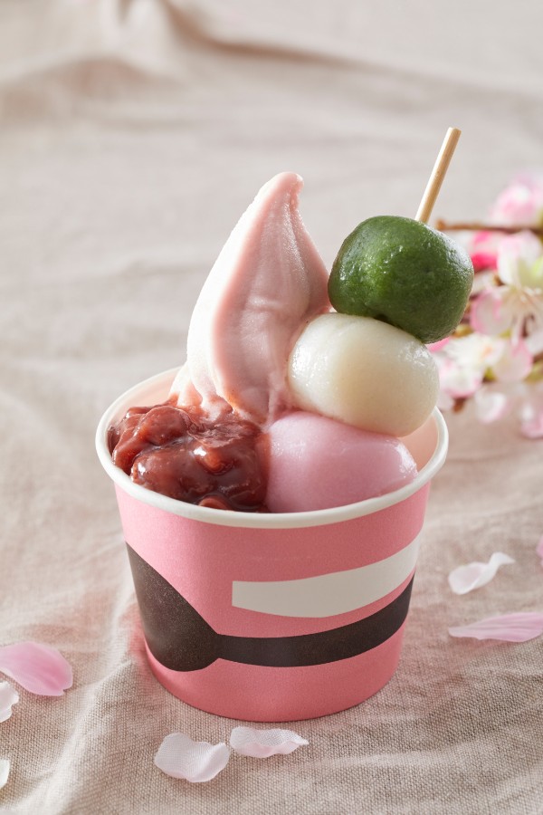 桜風味のソフトクリーム、三色団子、ゆで小豆
