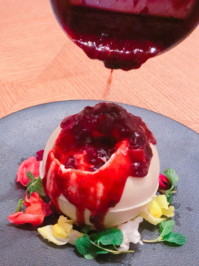 季節限定のホワイトチョコドームはホワイトチョコレートで出来たドームに、ラズベリーの甘酸っぱいソースをかけると、今話題のいちごやアイスクリームが出てくるスタイル。