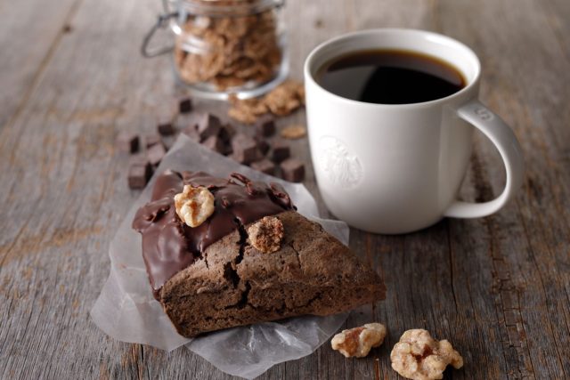 香ばしいコーンフレークの食感が楽しいスコーンです。スターバックスオリジナルチョコレート、ココアパウダー、レーズンペースト、シナモンなどが練りこまれた風味豊かな生地に胚芽入りのコーンフレークを1枚1枚丁寧にのせて焼き上げています。仕上げにチョコレートとメイプルコーティングのクルミをトッピングしました。