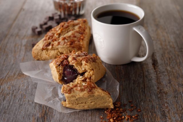 温めるとサプライズが楽しいスコーンです。生地はアーモンドのダイスやペースト、素焚糖(すだきとう)で香ばしくやわらかな味わいに仕上げています。その上に大麦、アーモンドダイス、ハチミツなどを混ぜた特製グラノーラをトッピングし焼き上げました。温めると中に入っているスターバックスオリジナルチョコレートクリームがとろりと溶けてより美味しく食べられます。