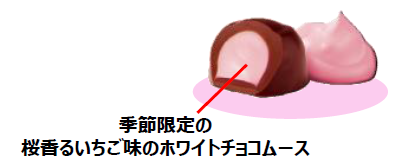 1. 軽い口どけに仕上げた桜香るいちご味のホワイトチョコムースを、ガーナチョコで包み込みました。