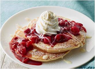 ストロベリーソースとコンデンスミルクをたっぷりとかけたパンケーキ。