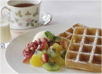 〈カフェ 英國屋〉フルーツワッフル1,080円、(ドリンクセット)1,404円/7階
