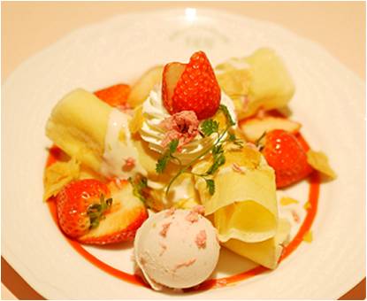 桜餡と国産苺をクレープ生地で包み、桜の香りをつけたホワイトチョコソースや苺のジェラートと合わせました。
