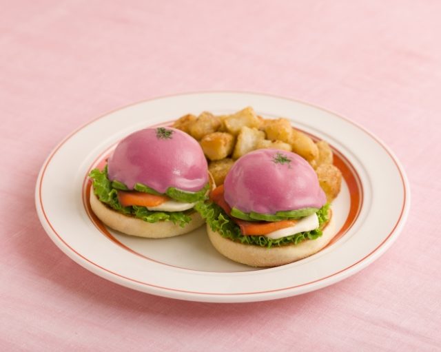 スーパーフードとして注目されているビーツとホワイトソースを合わせた春色オランデーズソースのエッグスベネディクト。スモークサーモン、モッツァレラチーズ、アボカドと一緒に食べられます。