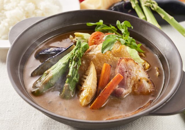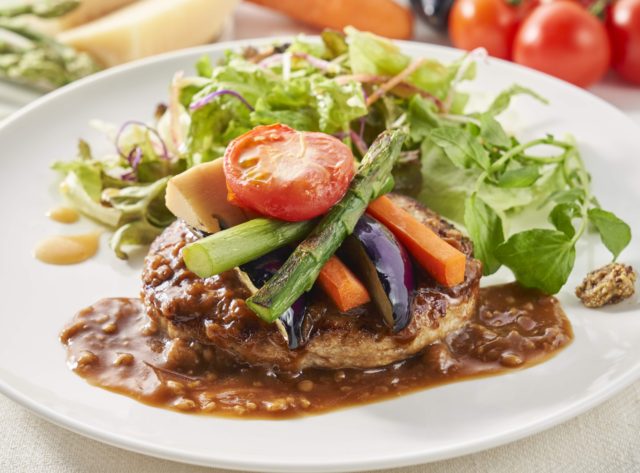 牛は、「高原黒牛(交雑)」(広島産)と「しほろ牛」(北海道産)の赤身がおいしい2つのブランド牛を順次ローテーションさせて提供、肉の旨味をそのまま楽しめるステーキに仕上げます。豚は、「美ら島あぐー」(沖縄産)を使い、脂身のおいしさが際立つハンバーグに仕立てました。ソースも脂の甘みと相性の良い特製黒糖ソースで提供します。鶏は、弾力があり、脂ののった「阿波尾鶏」(徳島産)のもも肉を、たっぷりの野菜と一緒に煮込んだスープカレーで提供します。さらに各お肉メニューには筍・ナス・人参・トマトなど見た目も彩り豊かな 野菜を添え、栄養バランスのよい食事を楽しめます。