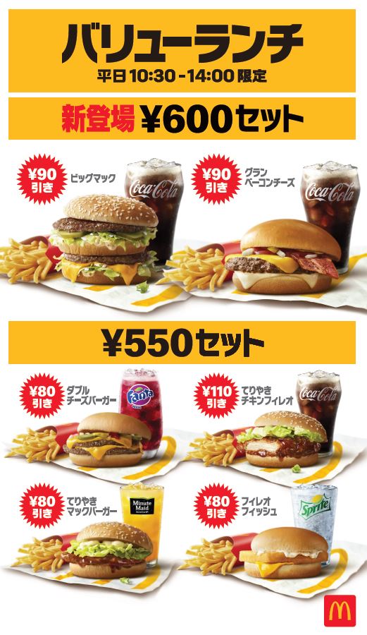 日本マクドナルド株式会社は、4月10日(水)より、平日10時30分から14時まで提供しているお得なランチセット「バリューランチ」の新たなラインアップとして、ボリューム感とそのおいしさで人気の「ビッグマック」のセットと、「グラン ベーコンチーズ」のセットを、それぞれ600円(税込)で提供します。