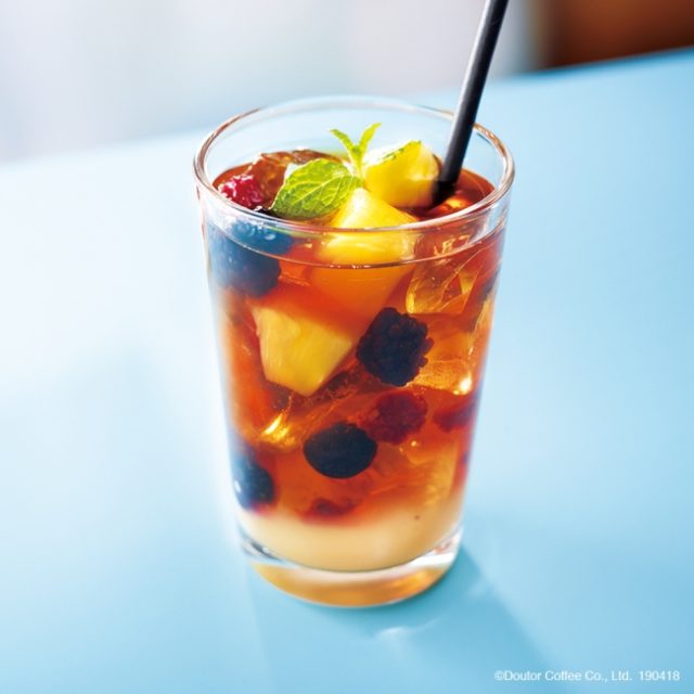 5種(パイナップル、ブルーベリー、ブラックベリー、ラズベリー、ストロベリー)のごろっとしたフルーツを使用したティードリンクです。日差しの暖かい日は、お好みのフルーツティーを持ってTO GO。ピーチアイスティーとゼリーinアイスティー、どちらを選んでもフルーツの食感と紅茶の爽やかさを楽しめます。