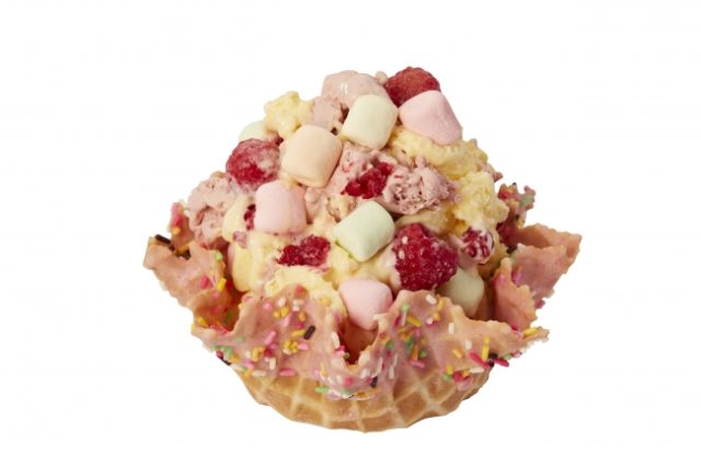 カスタードプリンアイスクリーム、ストロベリーアイスクリーム、ラズベリー、パステルマシュマロ