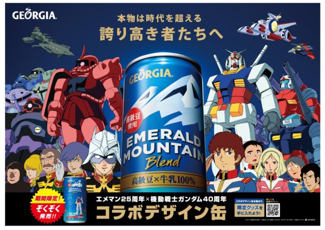 コカ・コーラシステムは、「ジョージア エメラルドマウンテンブレンド」の発売25周年を記念して、TVアニメ放送開始から40周年を迎える「機動戦士ガンダム」とコラボレーションし、同作品の人気モビルスーツをパッケージにデザインした「ジョージア エメラルドマウンテンブレンド」×「機動戦士ガンダム」【コラボデザイン缶】全25種類を展開します。