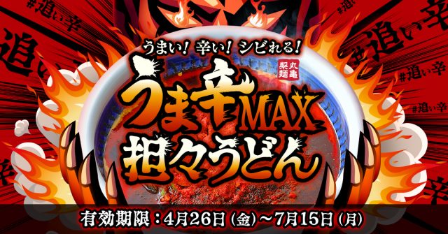 株式会社トリドールジャパンが展開する讃岐うどん専門店「丸亀製麺」では、昨年大好評だった、『うま辛担々うどん』の辛さを選べるキャンペーンを復活させ、『うま辛MAX担々うどん』として4月26日(金)〜7月15日(月)の期間限定で販売します。