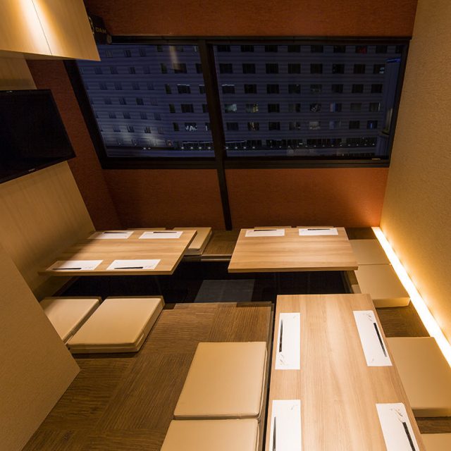 一見普通の飾り棚に隠されたおこもり感たっぷりの隠し個室や活気溢れるオープンキッチン、大きな窓から夜景を臨むテーブル席など、そこにいるだけで心躍る空間も魅力です。