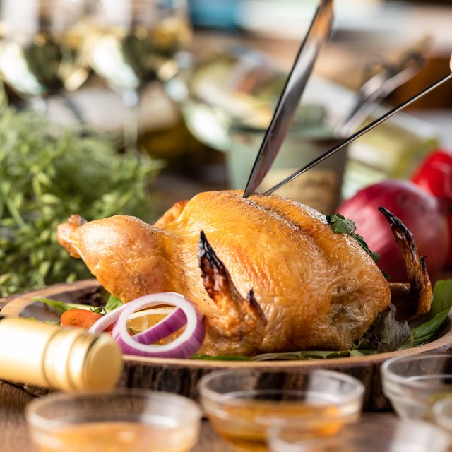 『一羽丸ごと!ローストチキンのアリゴチーズ詰め』は、4~5人前のボリュームであること、またじっくり時間をかけてローストしていることから、4名様以上のコース(要予約)にて提供となります。コースには、深い味わいとスモーキーな薫香の燻製料理やカレー、自分で作るから楽しい「カスタムシージャーサラダ」など、充実のラインナップを全8品ご用意しています。さらに、ワインだけでも10種以上、ビールやウィスキー、カクテルなど、種類豊富なスタンダード飲み放題付き。要望があれば、事前の予約にて『一羽丸ごと!ローストチキンのアリゴチーズ詰め』を単品(1羽3,280円/4~5人前)で提供することも可能です。