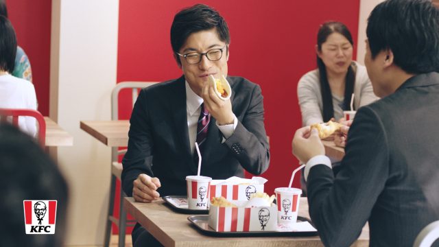 「オリジナルチキン」や、新登場の「チキンスライダー」を食べながらランチを満喫するストーリーを描いています。