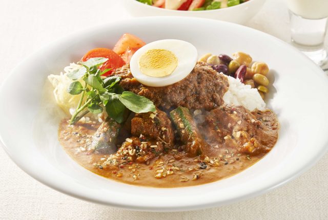 また、12種類のスパイスとハーブを使った本格派のカレーは、スパイシーでさっぱりとした野菜カレーと、豚肉の旨みや甘みを活かしたコク深いドライカレーを相盛りにし、タンドリーチキンやひよこ豆などを添えて提供します。2種のルーの味わいや香りの違いを楽しめる上、2つのカレーを一緒に味わうことで、より複雑なスパイス感や旨み、甘みを感じることができる一品となっています。その他、こだわりのビーフをたっぷりの薬味おろしで味わう、さっぱりお肉メニューも用意しています。
