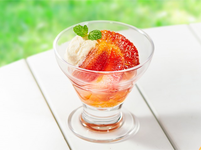 果実をたっぷり使った『ブラッドオレンジのデザート』は、食後でもさらっと食べられるフレッシュスイーツ。カロリーも嬉しい107kcal!