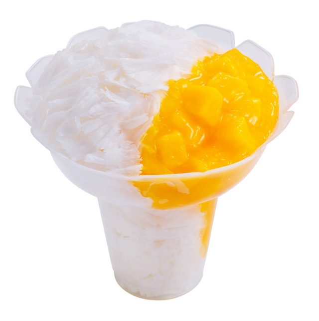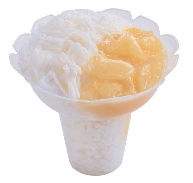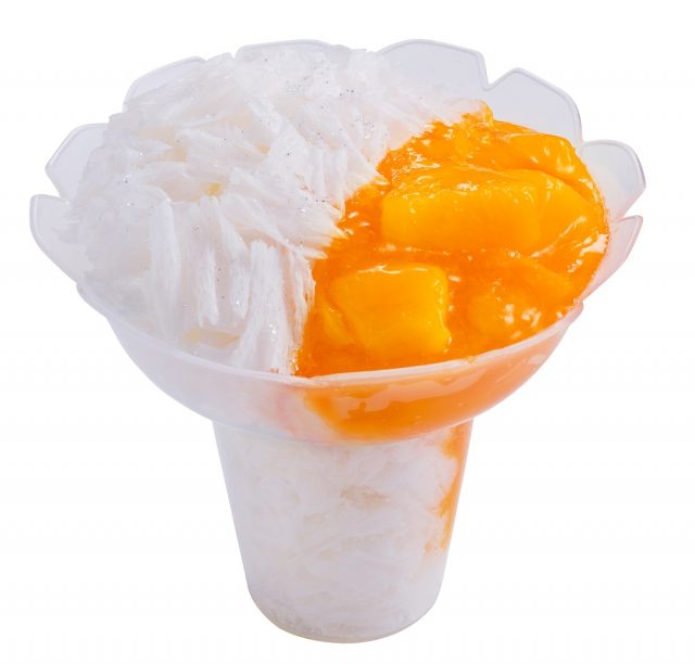 ミルク風味の氷をふわふわに削り、果肉入りマンゴーソースをトッピングしました。