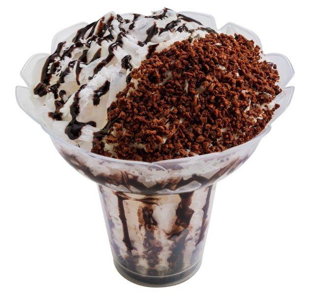 チョコレートソースの上に、ミルク風味の氷をふわふわに削り、チョコレートソース、チョコクランチをトッピングしました。