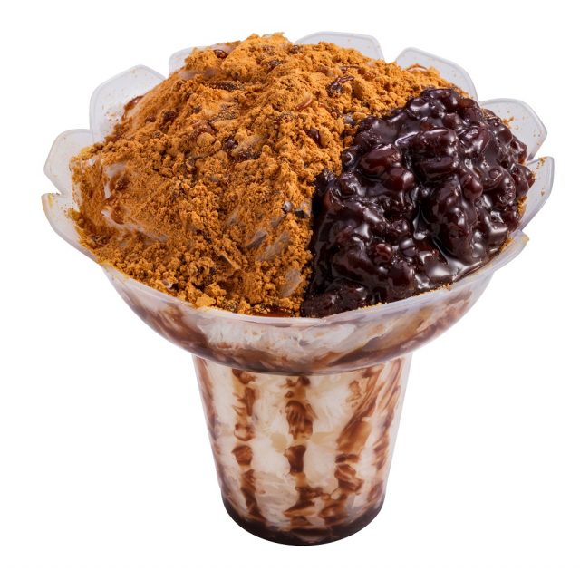 黒蜜ソースの上に、ミルク風味の氷をふわふわに削り、きなこ、あずきあん、黒蜜ソースをトッピングしました。