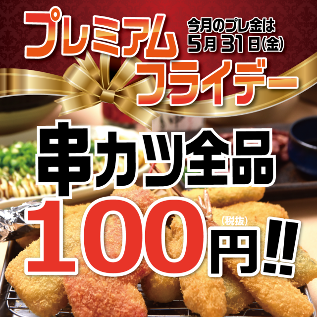 株式会社串カツ田中ホールディングスは、2019年5月31日(金)プレミアムフライデー当日に、串カツ田中ほぼ全店を15時オープンとし、串カツを全品終日108円で提供するキャンペーンを実施します。