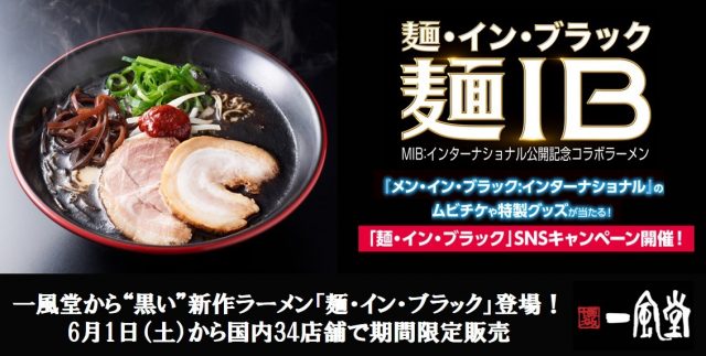 株式会社力の源ホールディングス傘下の株式会社力の源カンパニーが運営する「一風堂」は、6月14日(金)から日米同時公開される映画『メン・イン・ブラック:インターナショナル』とコラボしたラーメン「麺・イン・ブラック」を、6月1日(土)から6月30日(日)の期間限定で、日本国内34店舗にて販売します。