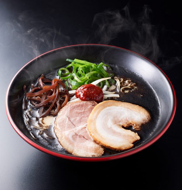 シルキーでまろやかなとんこつスープに焦がしにんにくを使用した特製の香油を加えることで、スープの表面を黒く仕立てました。さらにスープにブラックペッパーを加えており、ブラックペッパーのスパイシーさとにんにくの香ばしさが、まろやかなとんこつスープの中でアクセントとして活きています。麺は博多らしい歯切れの良い極細ストレート麺を使用。トッピングとして豚バラ肉とカタ肉の2種類のチャーシュー、もやし、ネギ、きくらげ、辛味噌を載せています。辛味噌をスープに溶かすと辛味が増し、より刺激的な一杯になります。