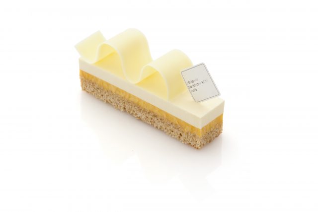パッションフルーツのクリームにホワイトチョコレートのクリームとココナッツの食感が楽しい生地を重ねて。パッションフルーツの酸味をホワイトチョコレートの甘さが優しく包みこみます。