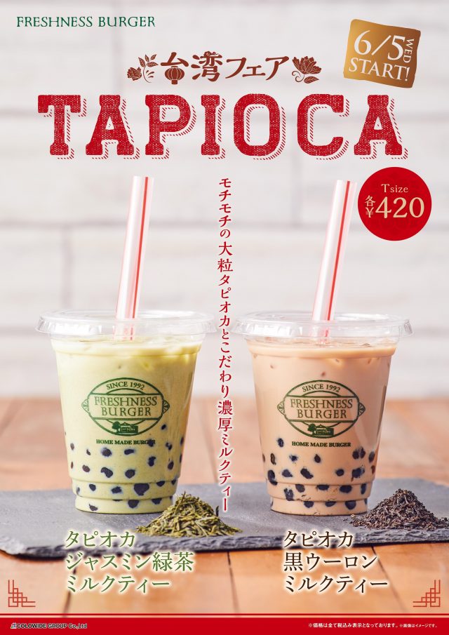 フレッシュネスバーガーでは大流行中の「タピオカドリンク」を気軽に楽しめるように“台湾フェア”と題して、食事と相性の良い甘さ控えめな大人の『タピオカ ジャスミン緑茶ミルクティー』、『タピオカ 黒ウーロンミルクティー』と『トンポーローバーガー』を用意しました。