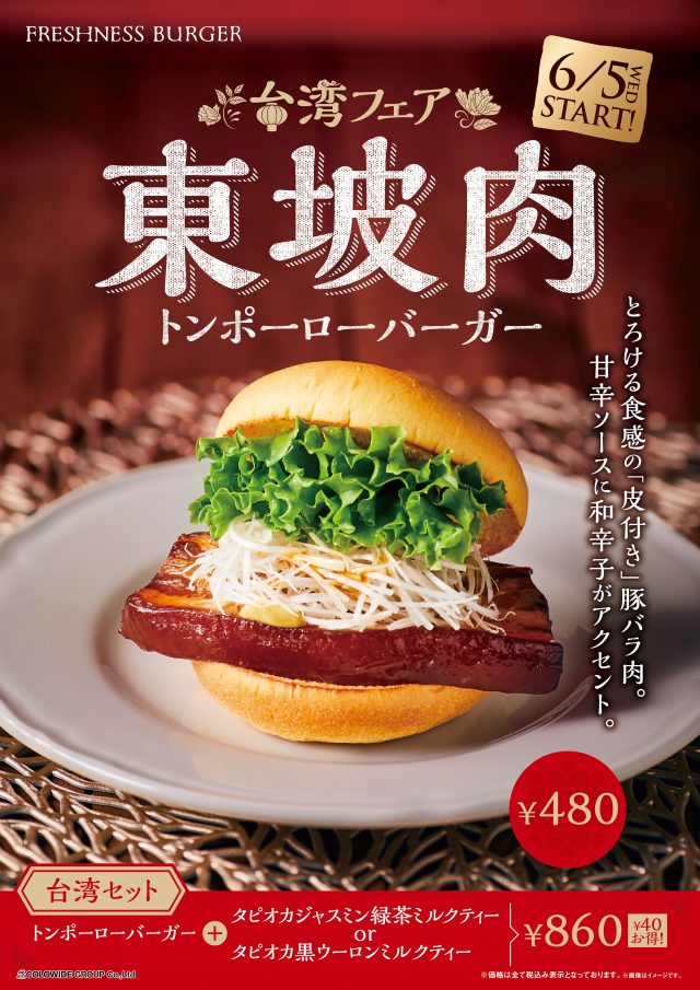 コロワイドグループの株式会社フレッシュネスが展開するハンバーガーチェーン「フレッシュネスバーガー」では、このたび、『タピオカ ジャスミン緑茶ミルクティー』と『タピオカ 黒ウーロンミルクティー』、『トンポーローバーガー』を2019年6月5日(水)より期間限定で販売します。