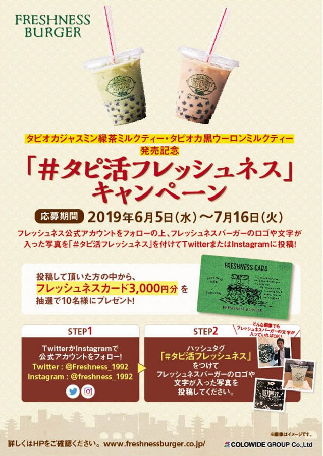 InstagramもしくはTwitterでフレッシュネスバーガーの公式アカウントをフォローの上、「#タピ活フレッシュネス」を付けて、フレッシュネスバーガーのロゴや文字が入った写真を撮って投稿することで応募ができます。投稿した方の中から抽選で10名様に、フレッシュネス専用リローダブルカード「フレッシュネスカード」3,000円分をプレゼントします。