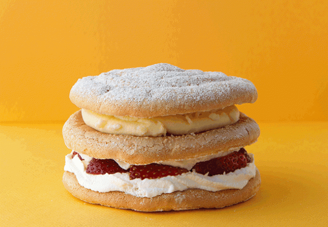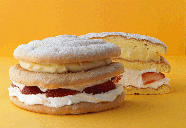 メレンゲと卵黄をたっぷり使って、ふわふわに焼き上げた生地に、たっぷりのチーズクリーム、カスタードクリーム、イチゴをサンドしました。フワトロワ1周年記念のスペシャルスイーツとなっています。