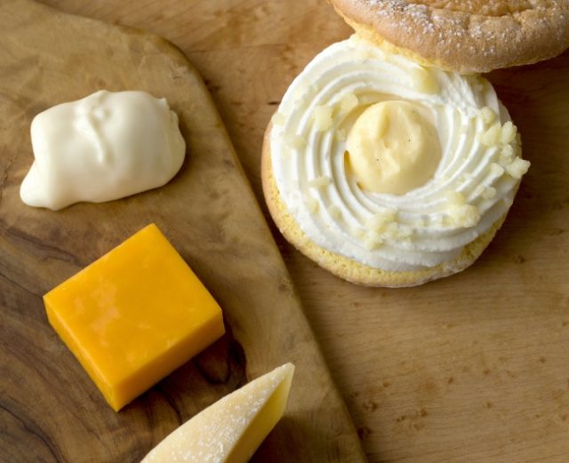 チェダーチーズパウダーとアーモンドパウダーを加え、サクッと焼き上げたブッセ生地は、噛むほどに感じるチーズの風味と優しい甘さ。チーズの風味豊かなバタークリームは、カマンベール、ゴーダチーズを合わせました。チーズとバターの奥深い味わいに満たされる、ブッセスタイルの新定番ブーシェブールとなっています。