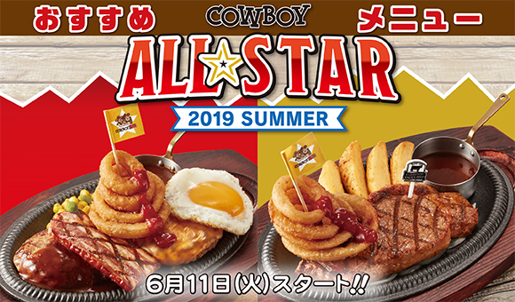 ロイヤルホスト株式会社が展開するステーキ・ハンバーグ・サラダバーのファミリーダイニング「カウボーイ家族」は、2019年6月11日(火)から、期間限定トッピングのハンバーグやステーキのメイン料理に、サラダバー&ドリンクバーを一緒に楽しめるセットを販売する「COWBOY ALL★STAR」を開催します。