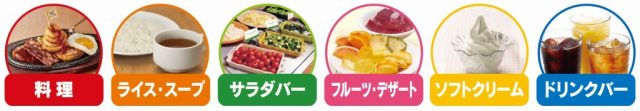 メイン料理に、フレッシュ野菜やデリサラダ、カレー、デザート、ソフトクリームなどが楽しめるサラダバー&ドリンクバーが付いた、カウボーイ家族の全部付き「オールスターセット」全5品となっています。