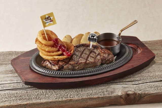 オニオンリングをトッピングしたアンガスサーロインステーキなどボリューム満点の料理を、カウボーイ家族自慢のサラダバー&ドリンクバーのフルセットでお得に楽しめるようになっています。