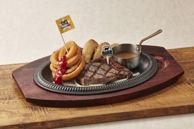 「COWBOY ALL★STAR」では、ボリューム満点の限定ハンバーグ&ステーキメニューを用意しました。ハンバーグは、柔らかい食感で肉汁たっぷりの合挽ハンバーグ2枚と、オニオンリングタワー、厚切りベーコン、チェダーチーズ、フライエッグをトッピングした「ダブル オールスターハンバーグ オールスターセット」をはじめ、2品がラインナップ。ステーキは、米国農務省(USDA)の品質基準より厳しいアンガス牛認定をクリアしたアメリカ産「サーティファイド・アンガス・ビーフ®(CAB)」を使用。柔らかく程よいサシと脂の旨みが特長のサーロインを使ったアンガスサーロインステーキに、合挽ハンバーグ、ソーセージグリルを盛り合わせた「アンガスサーロインステーキMIXコンボ オールスターセット」も提供します。