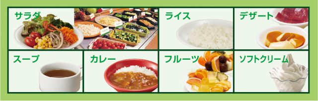 サラダバーは多彩な野菜のほか、デリサラダ、カレー、パスタ、デザート、フルーツ、ソフトクリームなど20種類以上のメニューを楽しめるようになっています。