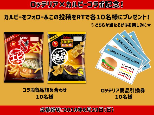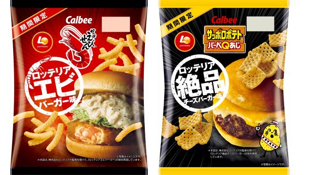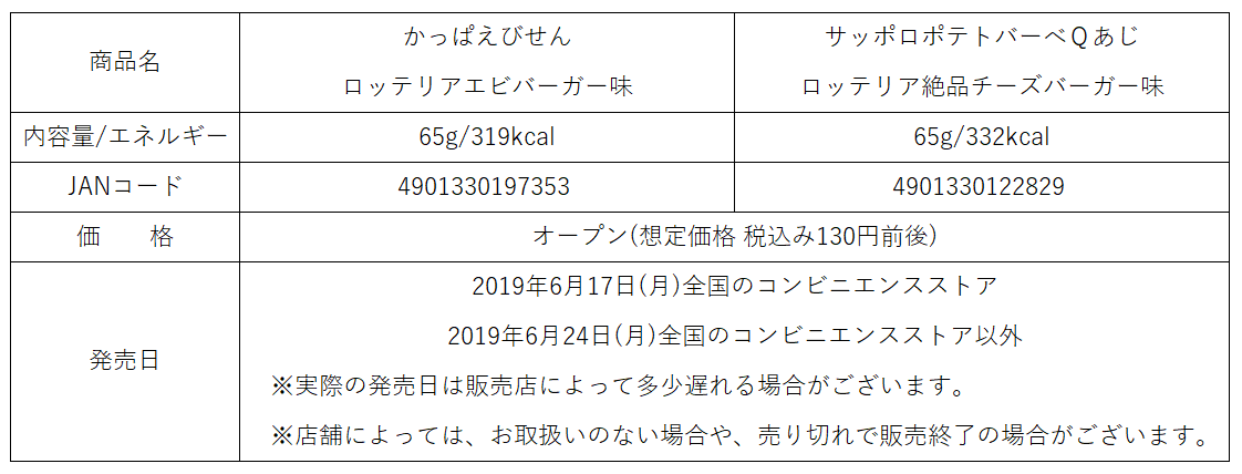 カルビー株式会社は、株式会社ロッテリアの看板商品「エビバーガー」と「絶品チーズバーガー」の味わいを再現したコラボレーション商品『かっぱえびせん ロッテリアエビバーガー味』『サッポロポテトバーべQあじ ロッテリア絶品チーズバーガー味』を2019年6月17日(月)から全国のコンビニエンスストアで先行発売します(コンビニエンスストア以外は2019年6月24日(月)から発売。2019年8月上旬終売予定)。